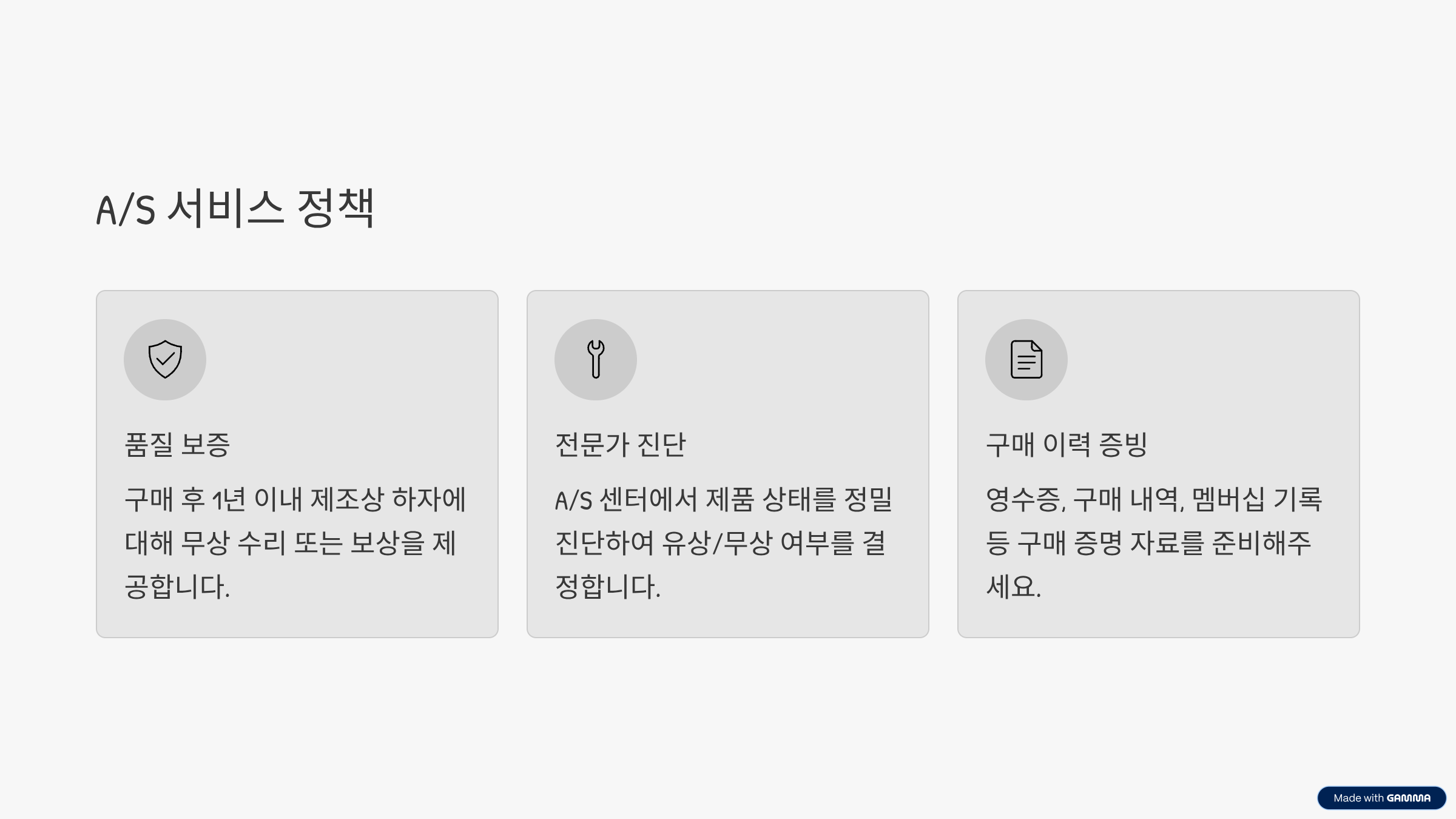 품질 보증 기간(1년) 이내의 제조상 하자는 무상입니다. 기간 경과 또는 소비자 과실로 인한 수리는 진단 후 유상 비용이 청구되며, 고객에게 사전 안내됩니다.