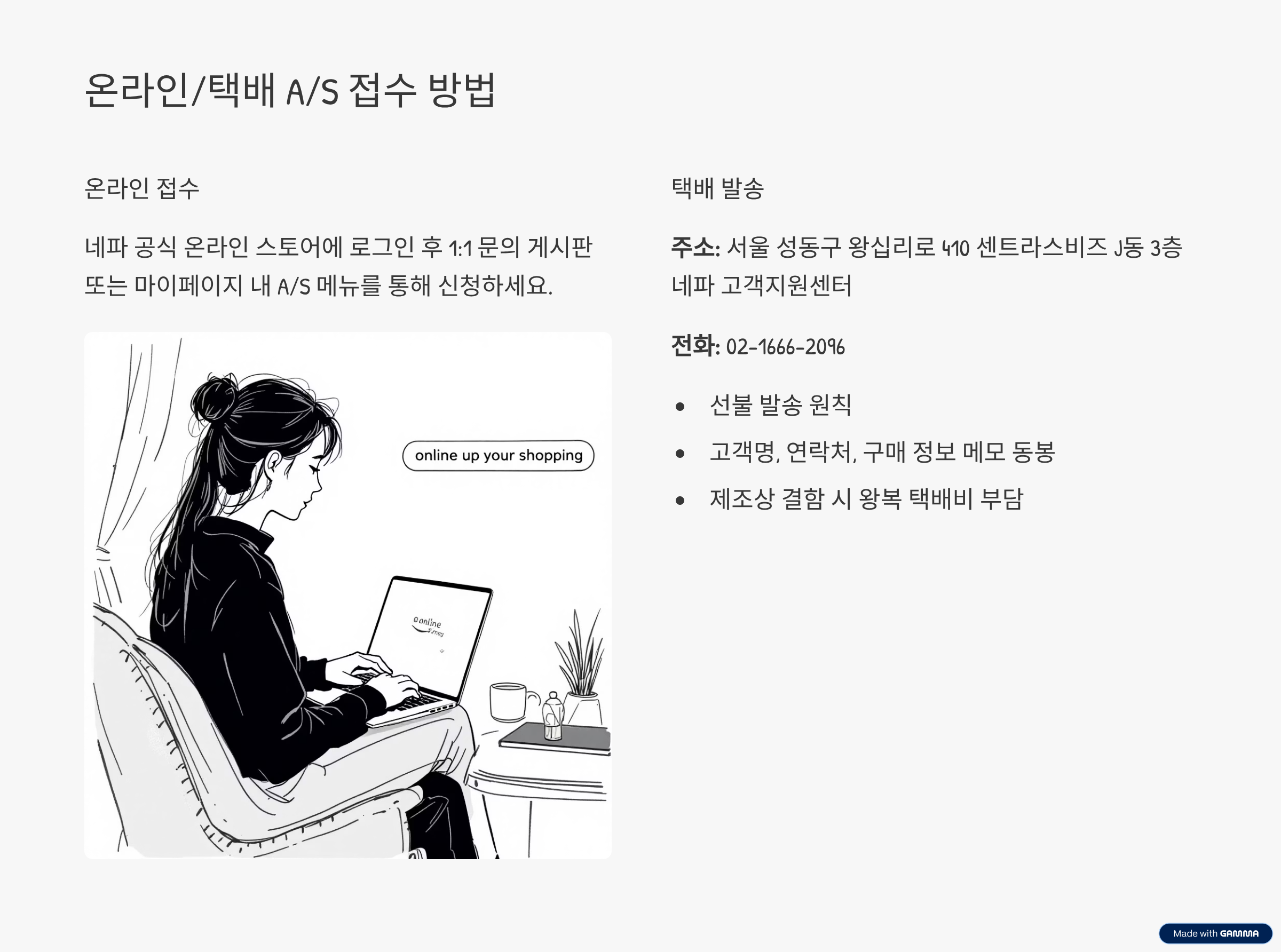 공식 온라인 스토어(네파몰)에서 구매했거나 매장 방문이 어려운 경우, 온라인 또는 택배를 이용해 직접 A/S를 접수할 수 있습니다.