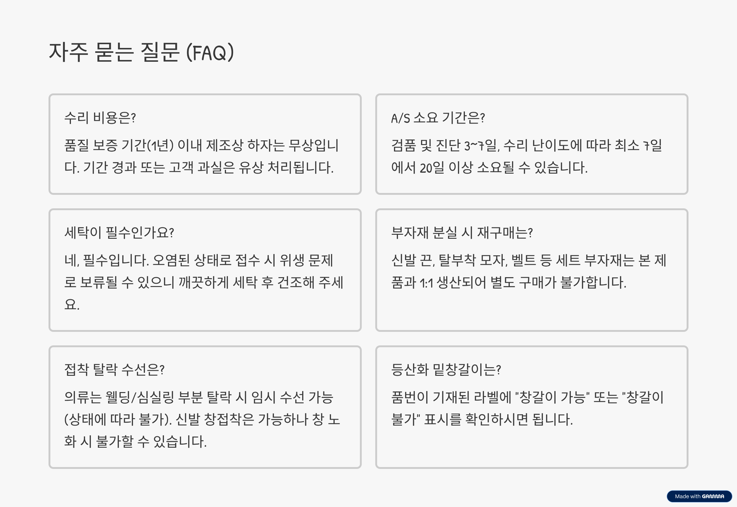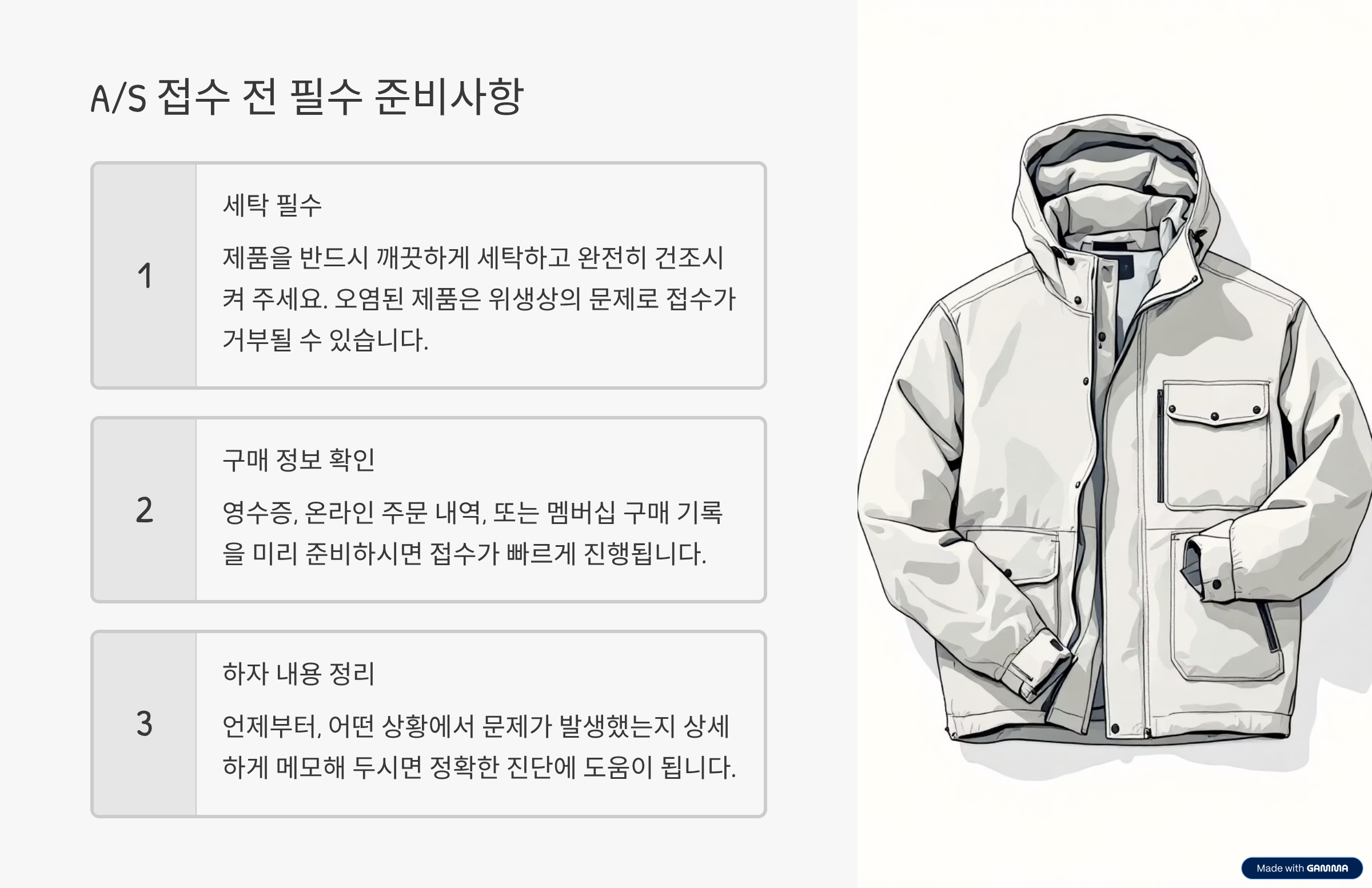 세탁 필수: A/S 접수 전, 제품은 반드시 깨끗하게 세탁 및 건조된 상태여야 합니다. 오염된 제품은 위생상의 문제로 접수가 거부되거나 지연될 수 있습니다.