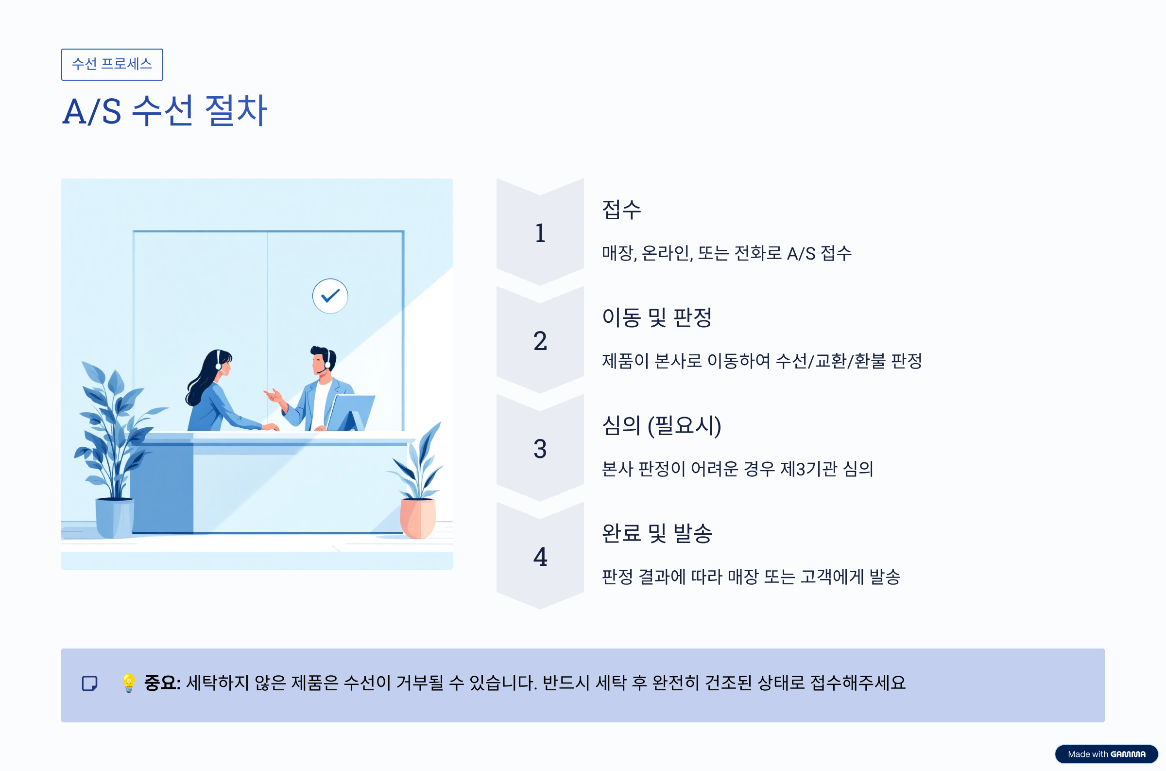 - 매장 직원이 수선 가능 여부를 1차로 확인해주며, 본사 심의 및 수선을 대행해 줍니다.