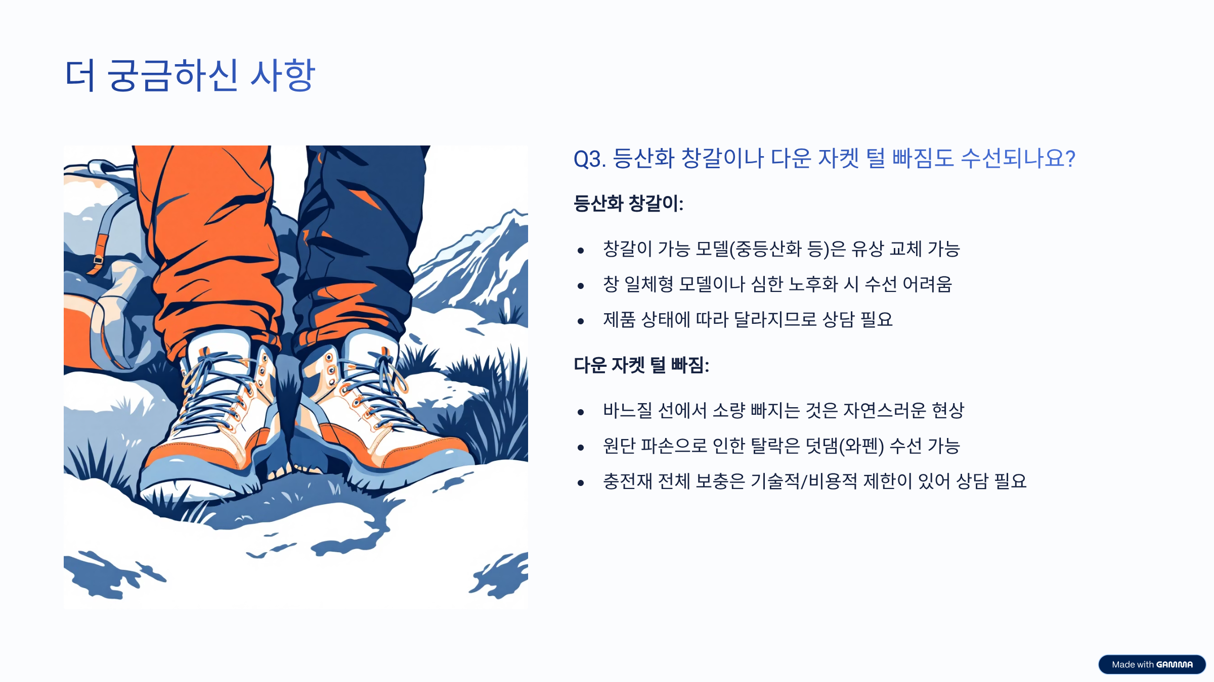 질문3. 등산화 창갈이나 다운 자켓의 털 빠짐 수선도 되나요?
