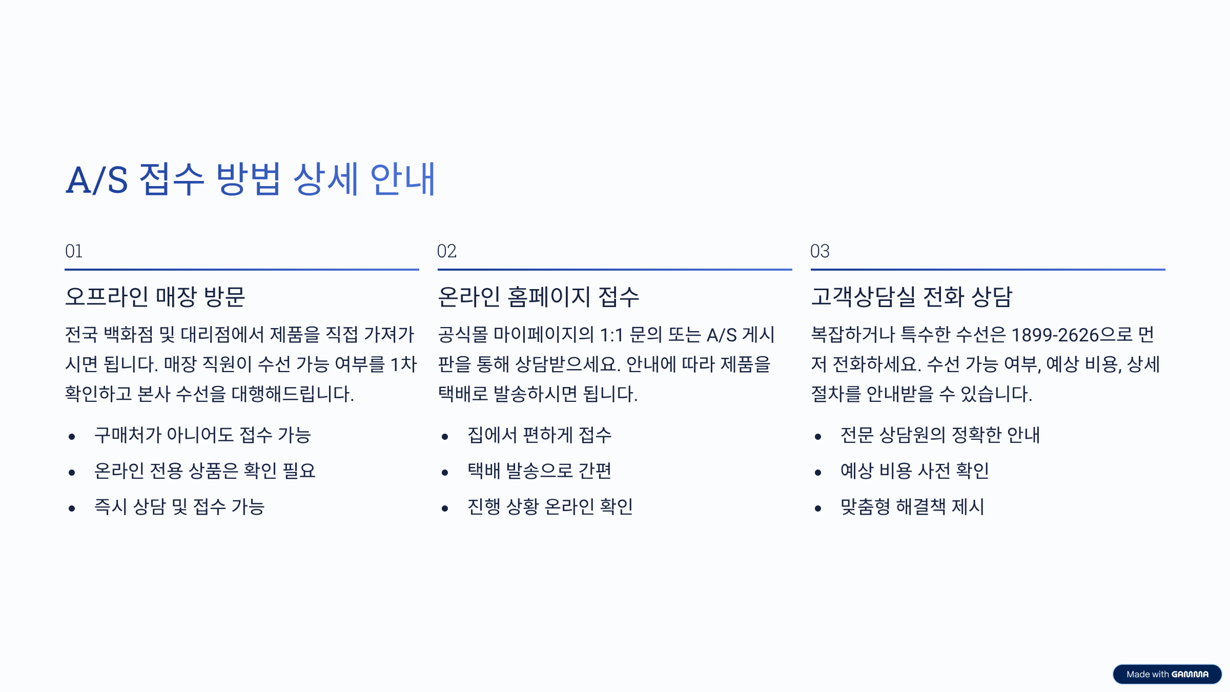 - 본사 소비자상담실(1899-2626)로 문의주시거나, 가까운 매장 또는 구입처에 AS 접수