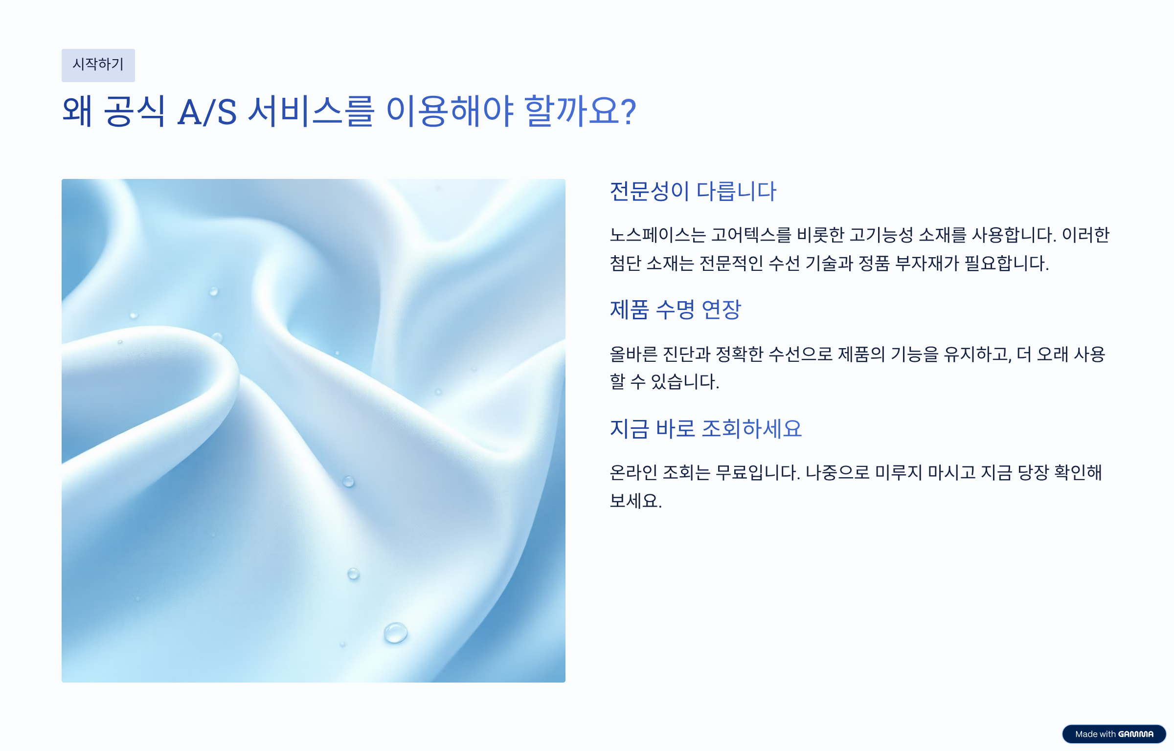 노스페이스는 영원 아웃도어에서 전개하는 글로벌 아웃도어 브랜드로, 고기능성 소재를 사용하는 만큼 전문적인 A/S 서비스가 중요합니다. 제품의 수명을 늘리고 기능을 유지하기 위해서는 공식 서비스 채널을 통해 정확한 진단과 수선을 받는 것이 좋습니다. 집에서 편하게 온라인으로 조회해보는 건 무료입니다. 나중으로 미루지 마시고, 지금 당장 조회해보시기 바랍니다.