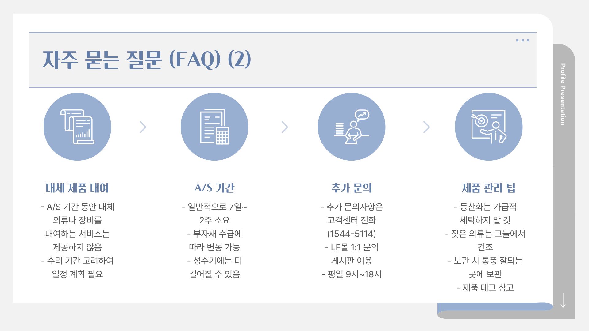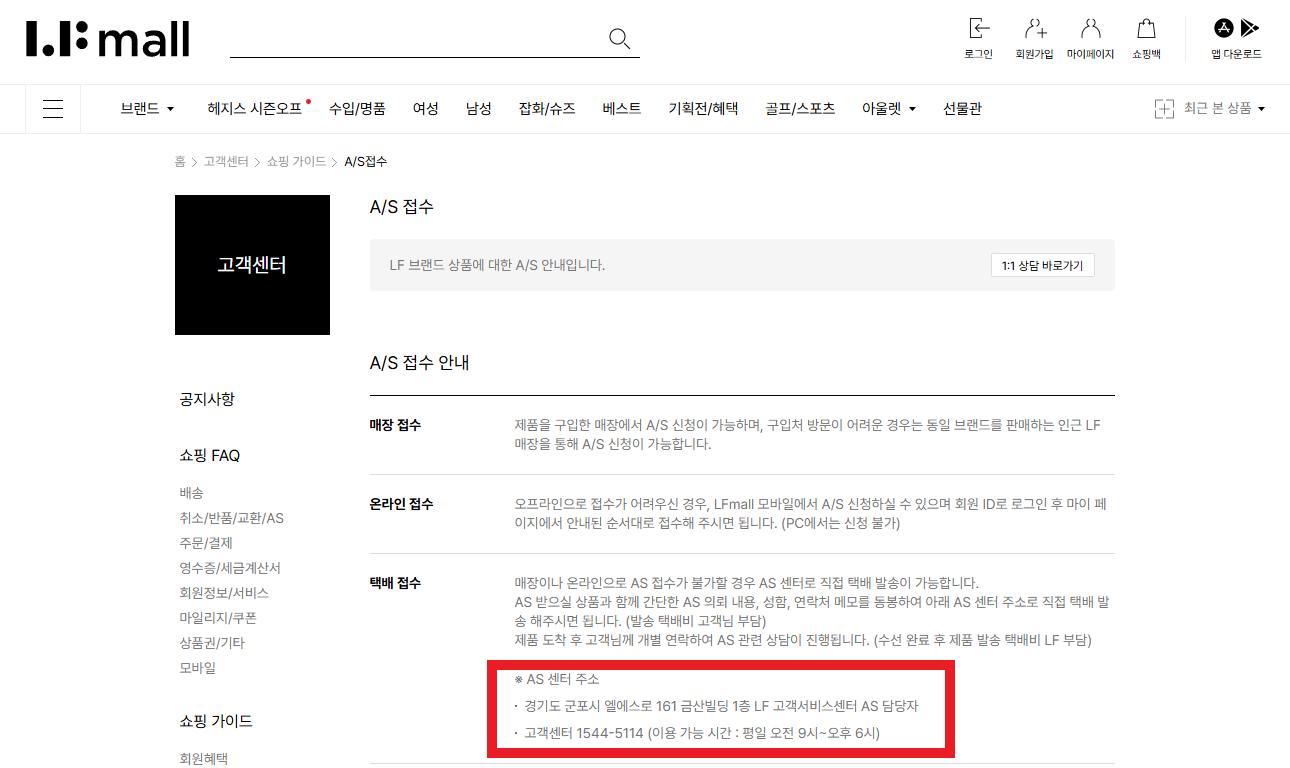 온라인 문의: 전화 연결이 어려울 경우, LF몰 1:1 고객 문의 게시판을 통해 문의 내용을 남기실 수 있습니다.