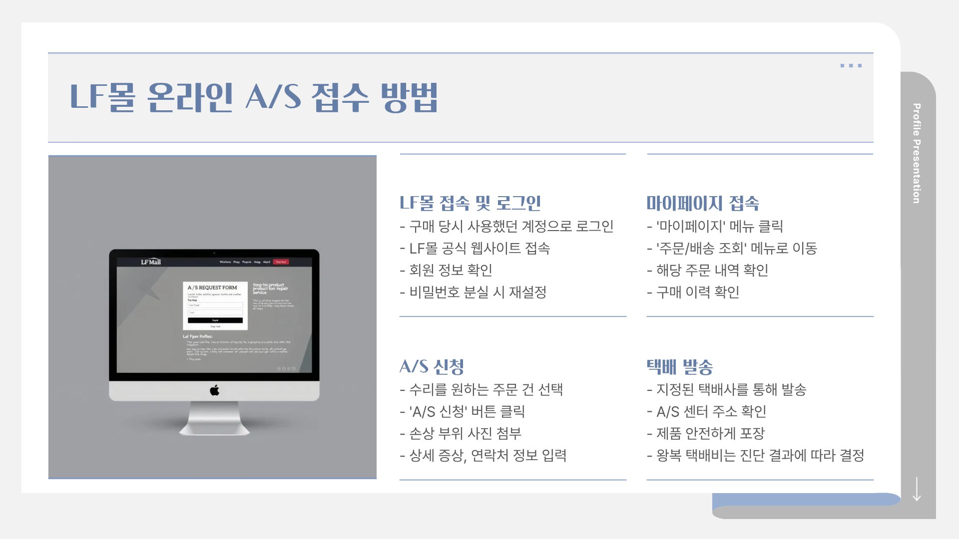 접수 채널 선택: 구매처(오프라인 매장 또는 LF몰)를 통해 접수하거나, LF A/S 센터로 직접 문의합니다.
