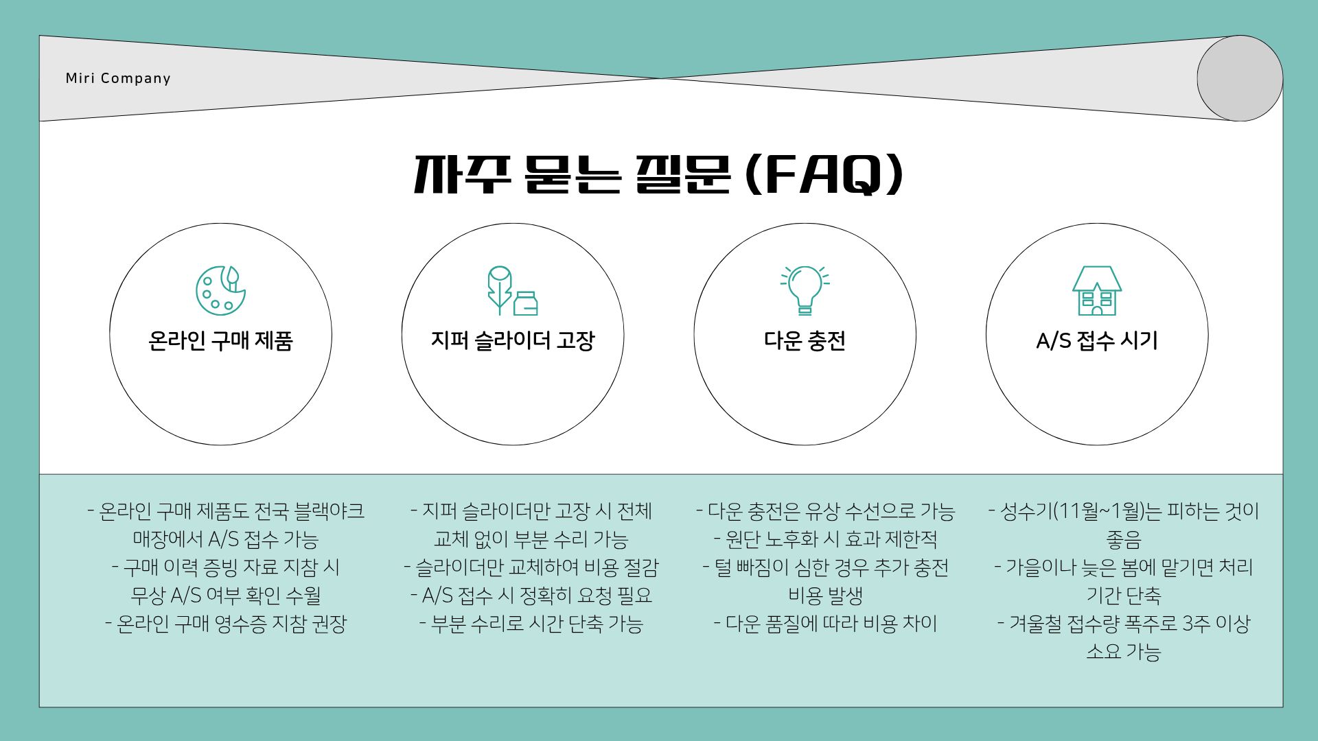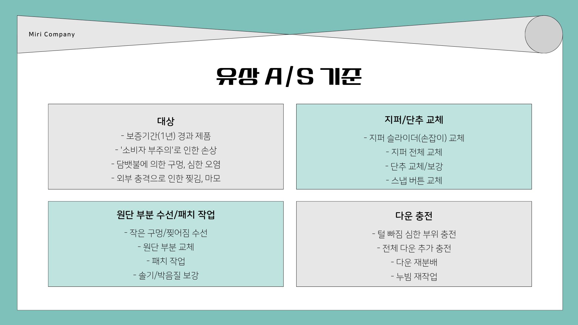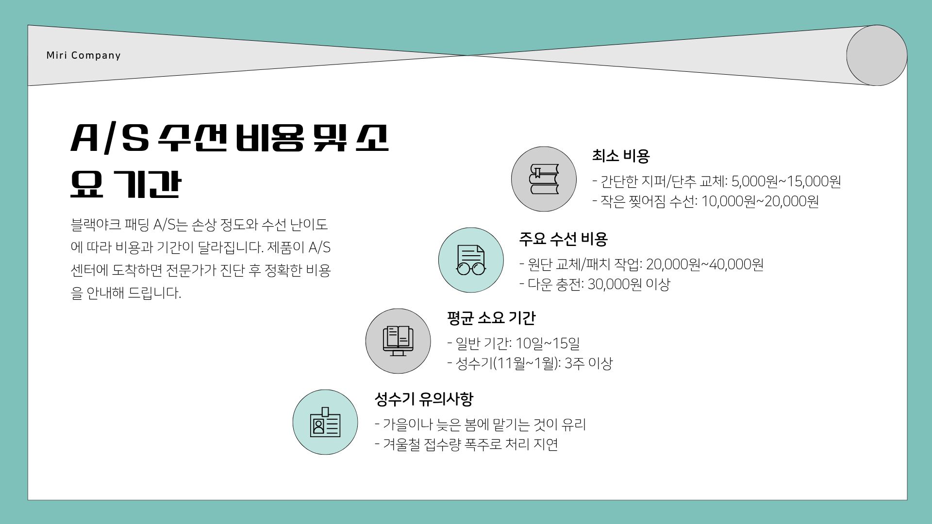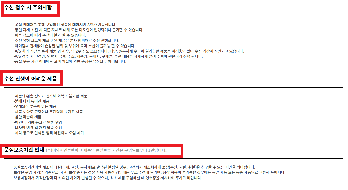 - 성수기 유의: 겨울 성수기(11월~1월)에는 접수량이 폭주하므로, 수선 기간이 3주 이상으로 길어질 수 있습니다.