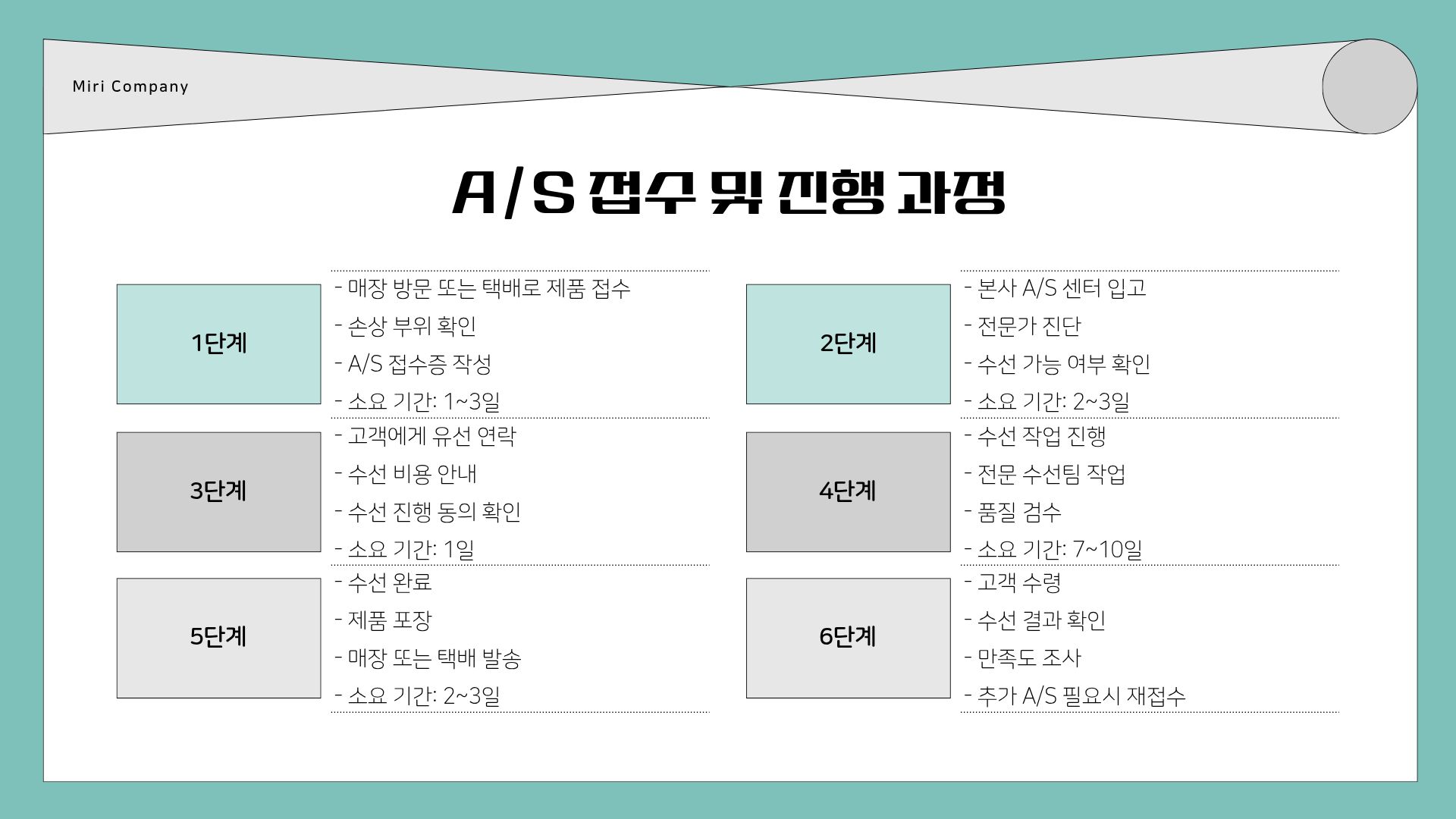 | 1단계 | 매장 또는 택배로 제품 접수 | 1~3일 | 택배 접수 시 메모 동봉 필수 |