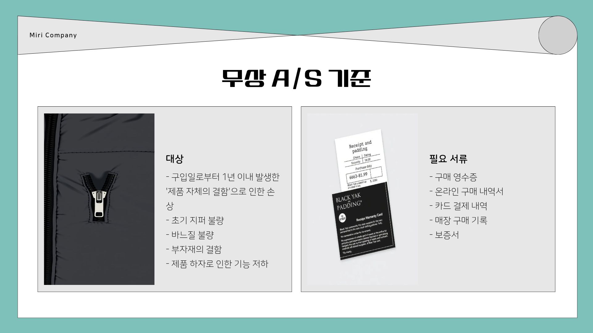 - 패딩의 손상 부위를 직원에게 보여주고 A/S 접수증을 작성합니다.