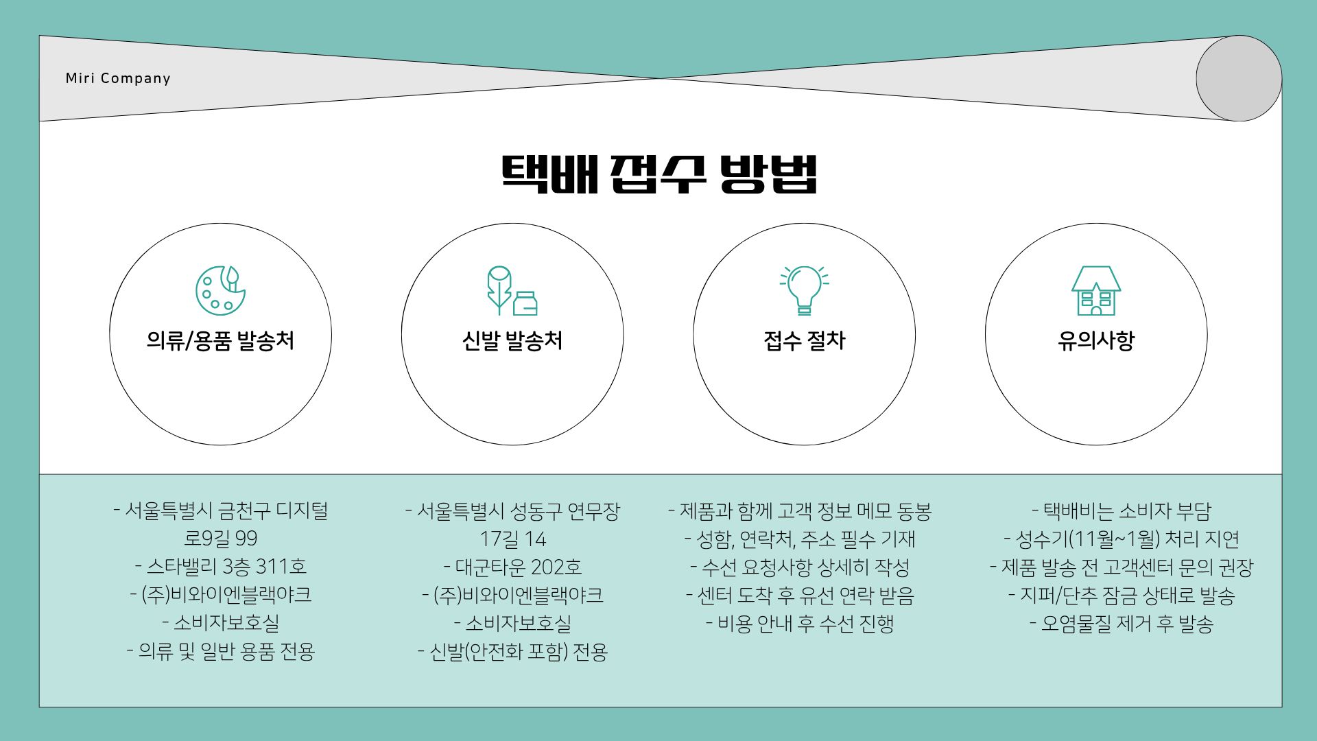 - 제품과 함께 고객 정보(성함, 연락처, 주소)와 수선 요청 사항을 상세히 기재한 메모를 동봉합니다.