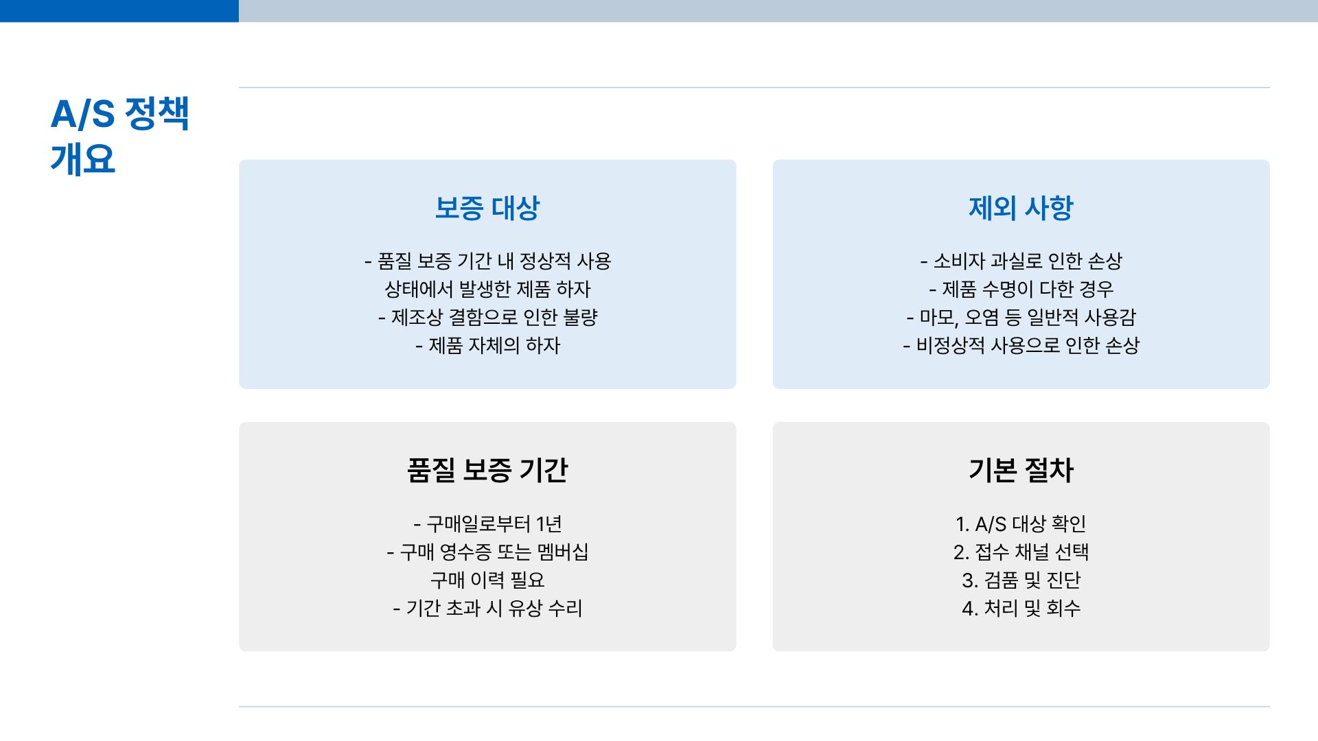 - A/S 대상 확인: 제품의 품질 보증 기간(구매일로부터 1년) 및 하자 유형을 확인합니다.