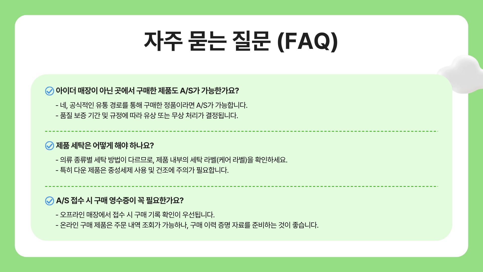 - 홈페이지 내 자주 묻는 질문(FAQ) 에는 기본적인 교환, 환불, 세탁 관리법 등이 정리되어 있어, 간단한 문의는 여기서 바로 해결할 수 있습니다.