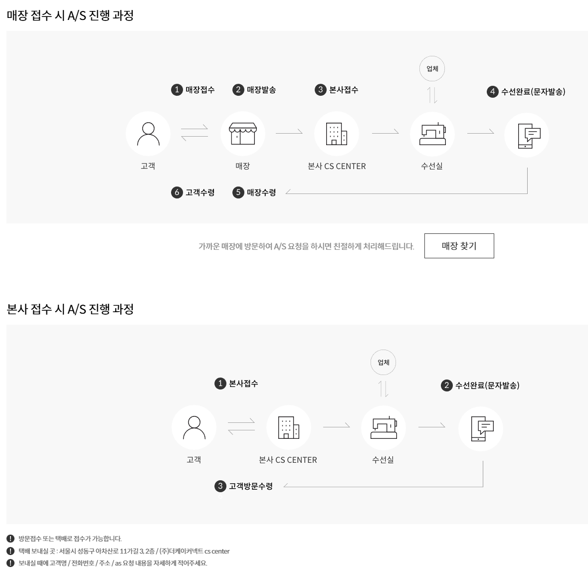 | A/S 접수 | 매장 방문 또는 택배 접수 | 택배 접수 시 사전 문의 필수 |