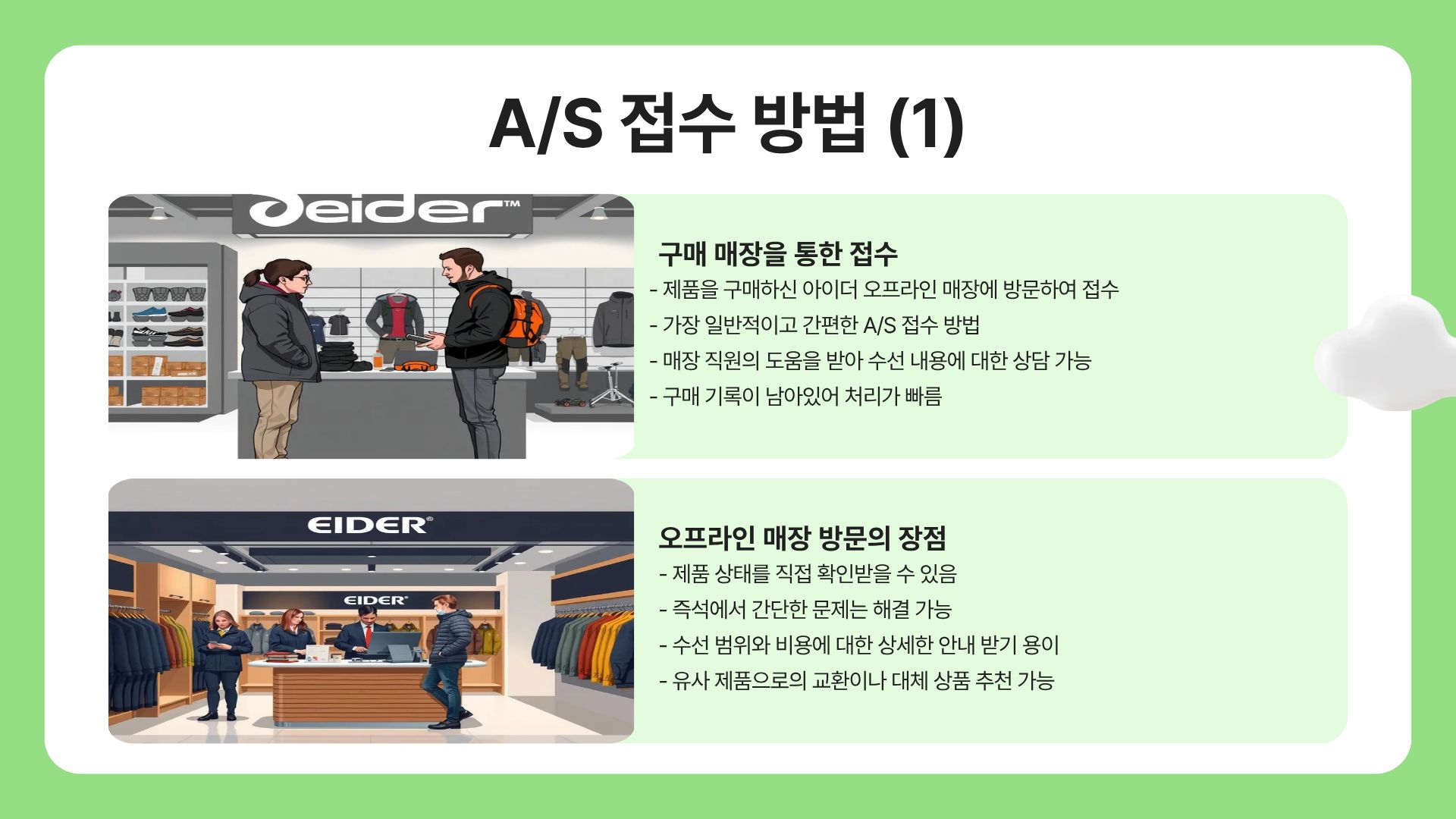 - 제품을 구매하신 아이더 오프라인 매장에 방문하여 접수하는 것이 가장 일반적이고 간편한 방법입니다.