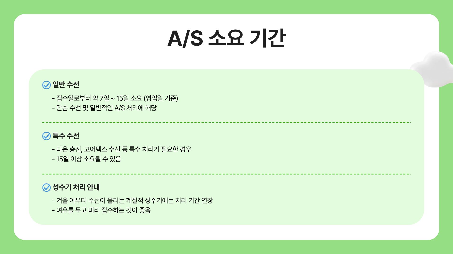 | A/S 기간 | 7일 ~ 15일 이상 (수선 종류에 따라 상이) | 성수기 지연 가능성 있음 |
