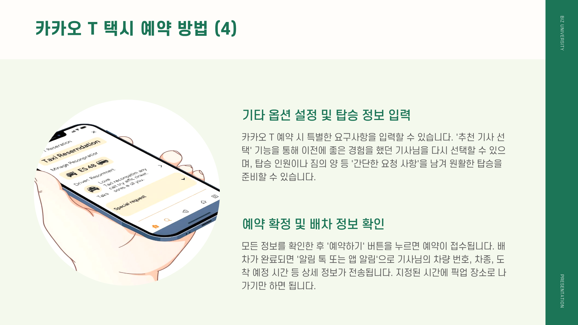 모든 정보를 꼼꼼히 확인한 후, '예약하기' 버튼을 누릅니다. 예약이 접수되면 시스템에서 배차 가능한 기사님을 찾기 시작합니다.