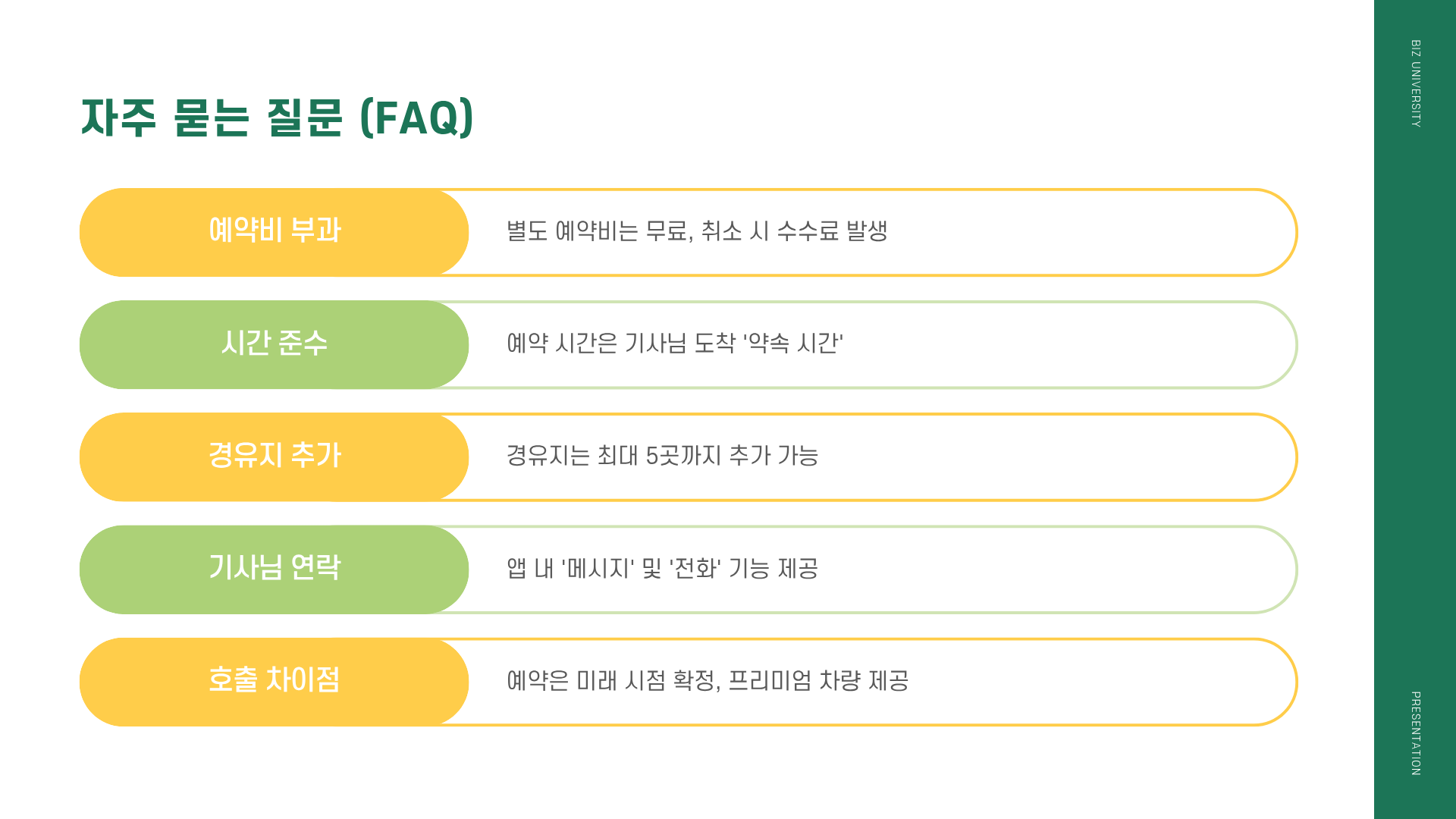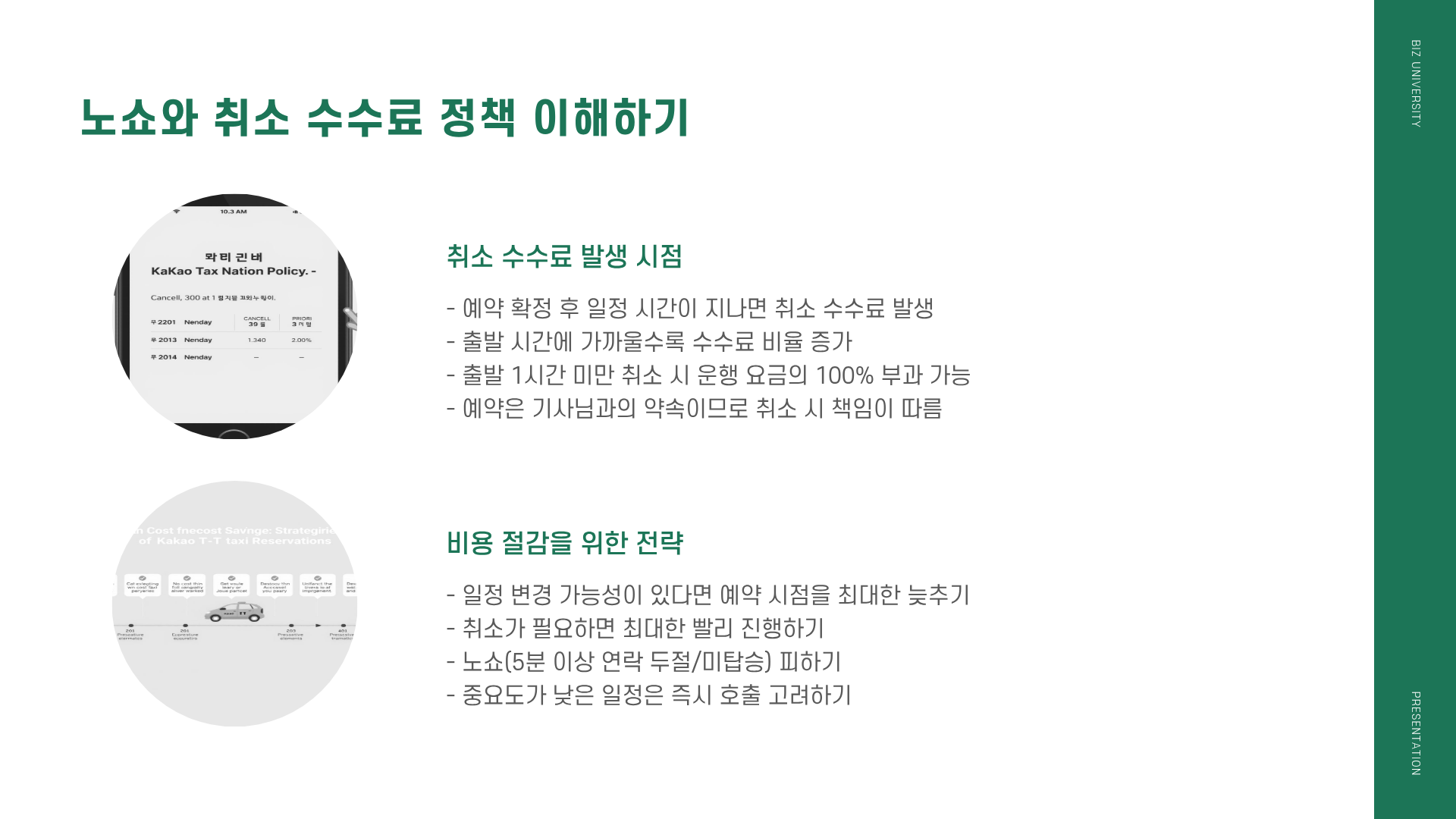 - 수수료 발생 시점: 예약 확정 후 일정 시간이 지나면 취소 시점에 따라 운행 요금의 최대 100%에 달하는 수수료가 부과될 수 있습니다. (예: 출발 1시간 미만 취소 시 100% 부과 등)