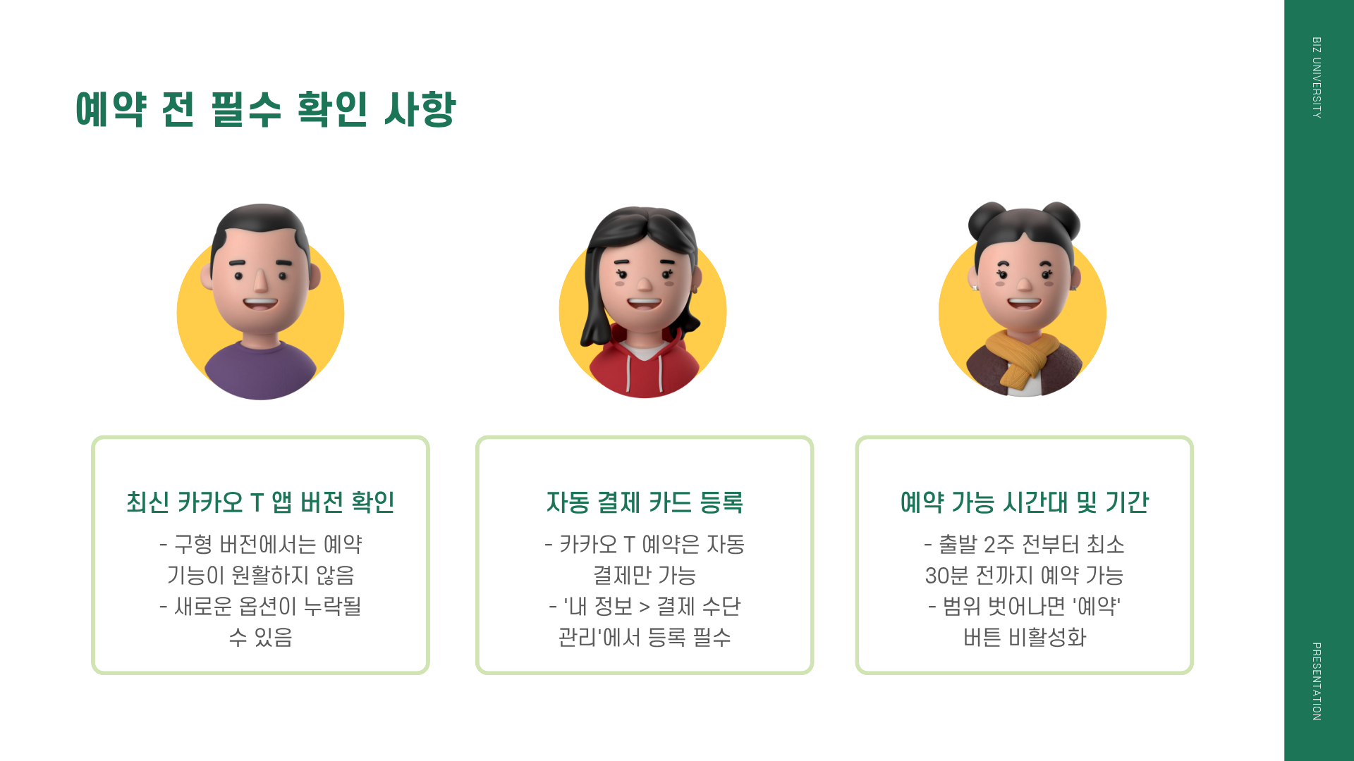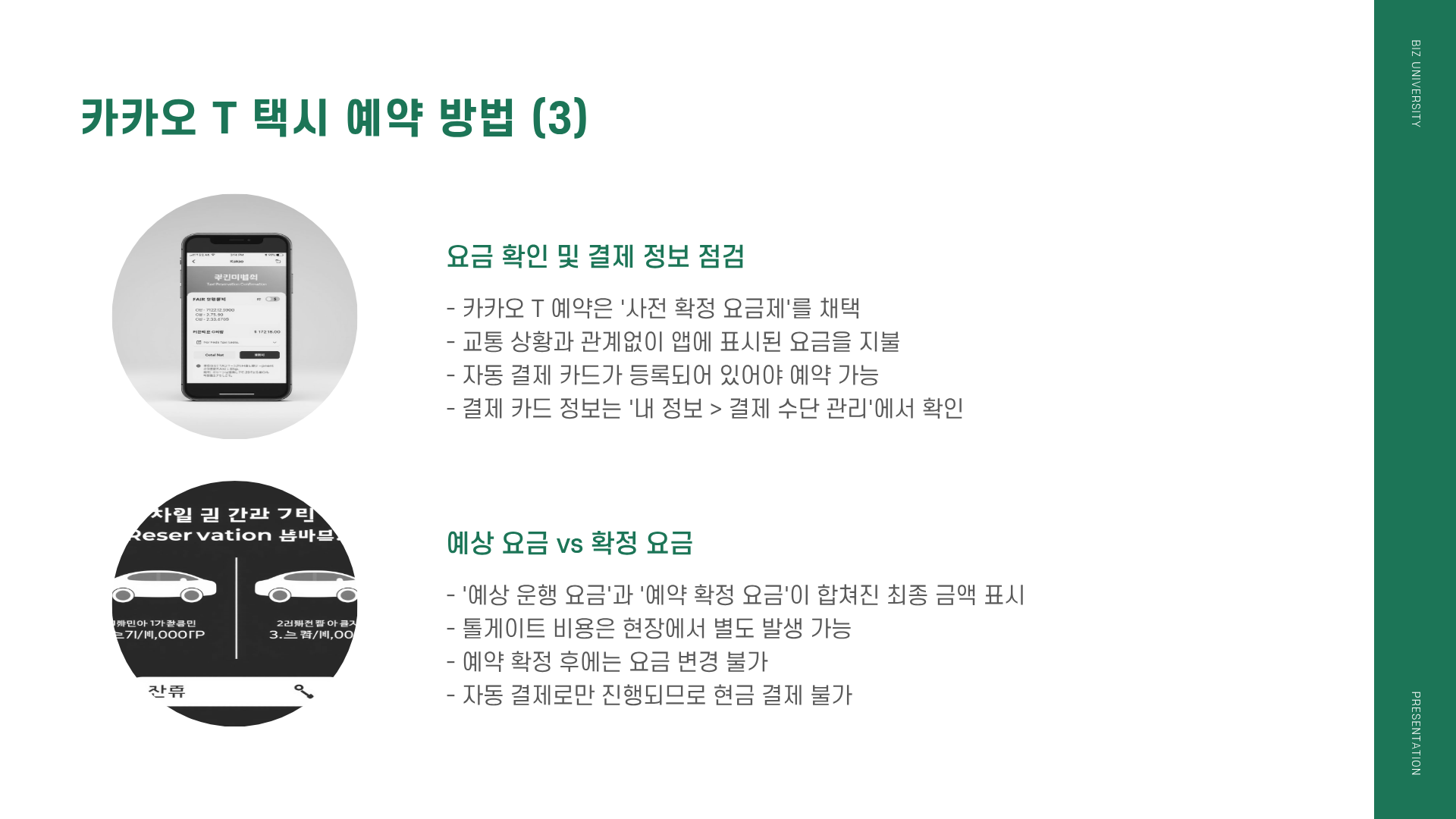 카카오 T 예약은 현재 자동 결제만 가능합니다. 예약 전 유효한 카드를 '내 정보 > 결제 수단 관리'에서 반드시 등록하세요. (미리 해두면 하차 시 불필요한 결제 과정을 생략할 수 있습니다.)