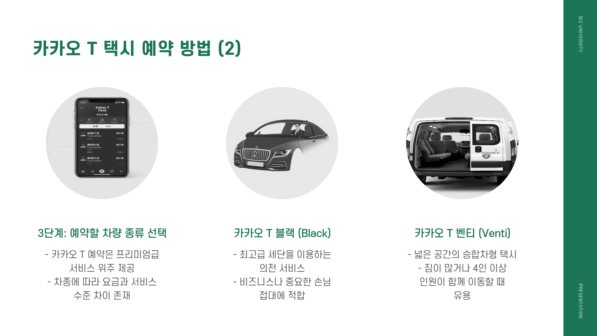 카카오 T 예약은 일반 중형 택시가 아닌 프리미엄급 서비스를 위주로 제공합니다.