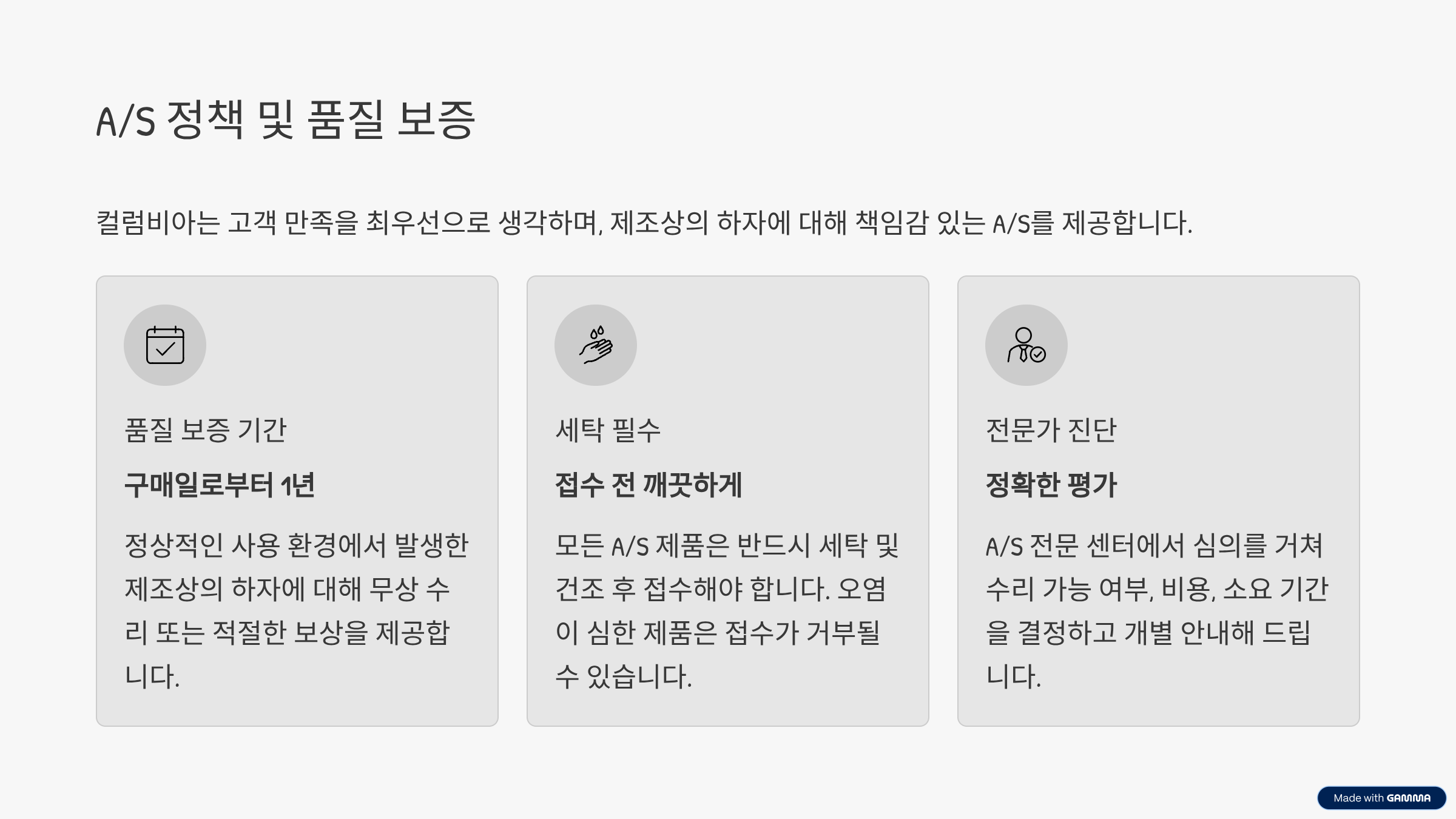 컬럼비아 제품의 A/S는 품질 보증 기간(구매일로부터 1년) 내에 정상적인 사용 환경에서 발생한 제조상의 하자에 대해 수리 또는 적절한 보상을 제공하는 것을 원칙으로 합니다.
