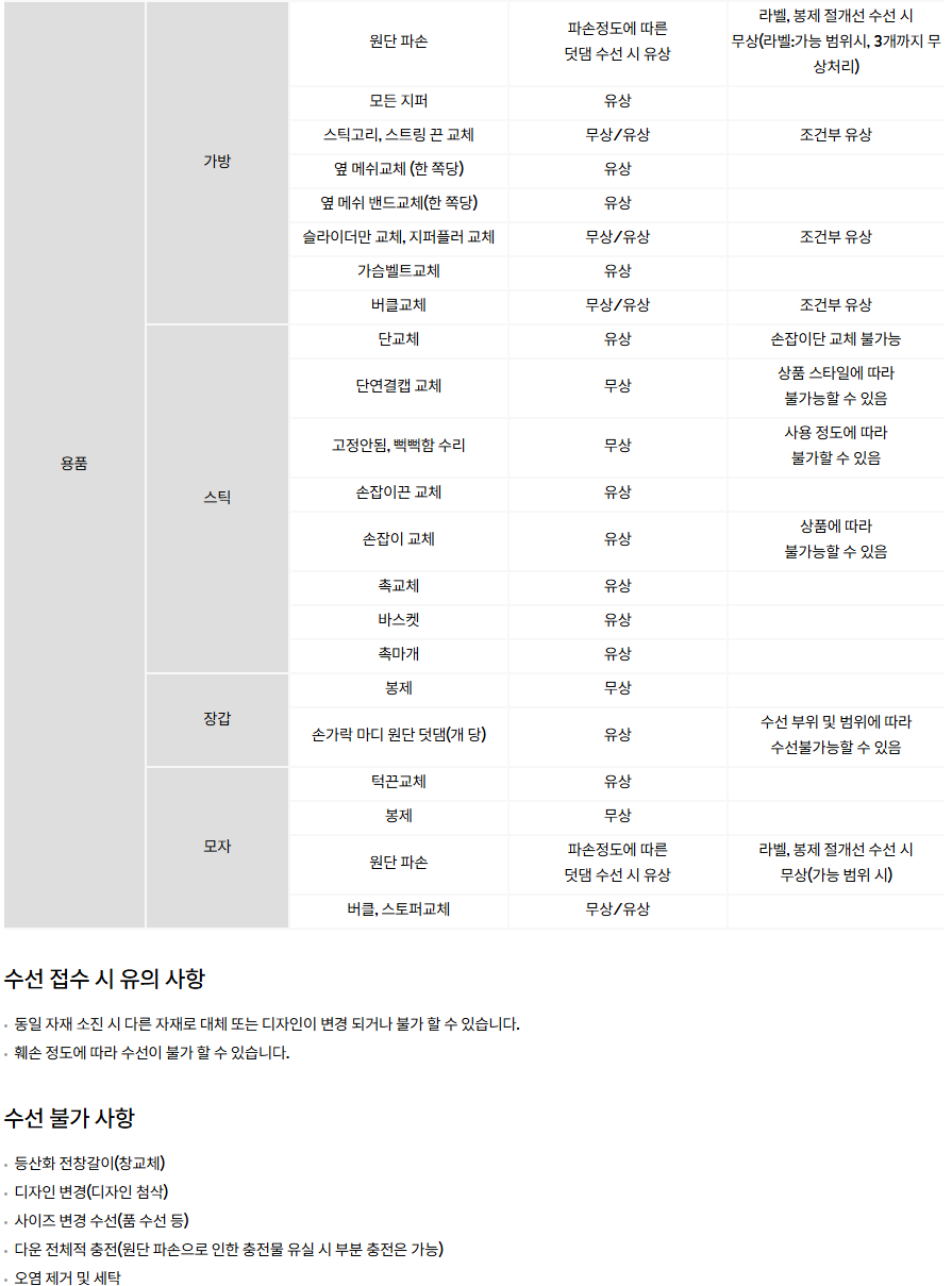 유/무상 구분: 품질 보증 기간 내 제조상 하자는 무상 수리가 원칙입니다. 그러나 소비자 과실에 의한 파손, 자연적인 제품 수명(마모, 오염 등)으로 인한 손상은 유상 수리로 진행되거나 A/S 자체가 불가할 수 있습니다.