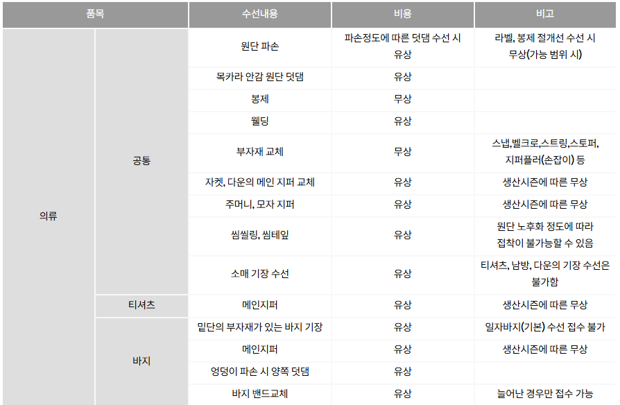세탁 필수: 모든 A/S 제품은 반드시 깨끗하게 세탁 및 건조한 상태로 접수해야 합니다. 오염이 심한 제품은 A/S 심의 및 수리 과정에 문제가 발생하여 접수가 거부되거나 지연될 수 있습니다.