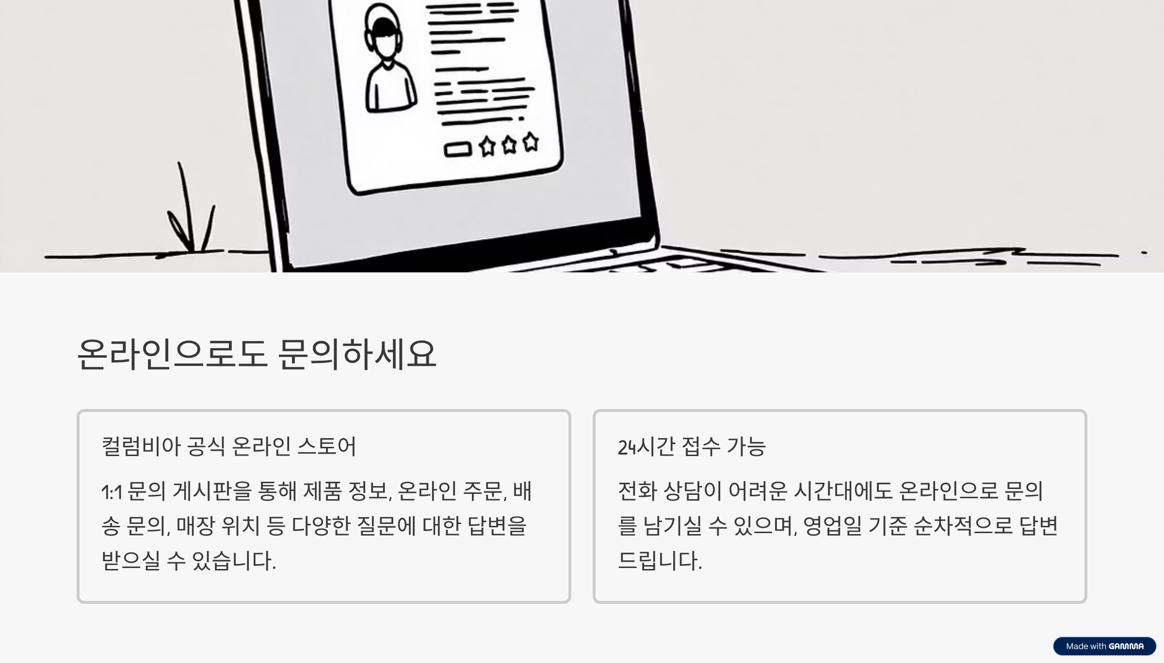 컬럼비아 고객센터는 제품 정보, 온라인 주문/배송, 매장 위치 등 일반적인 문의사항은 대표 고객센터를 통해 상담받을 수 있습니다.