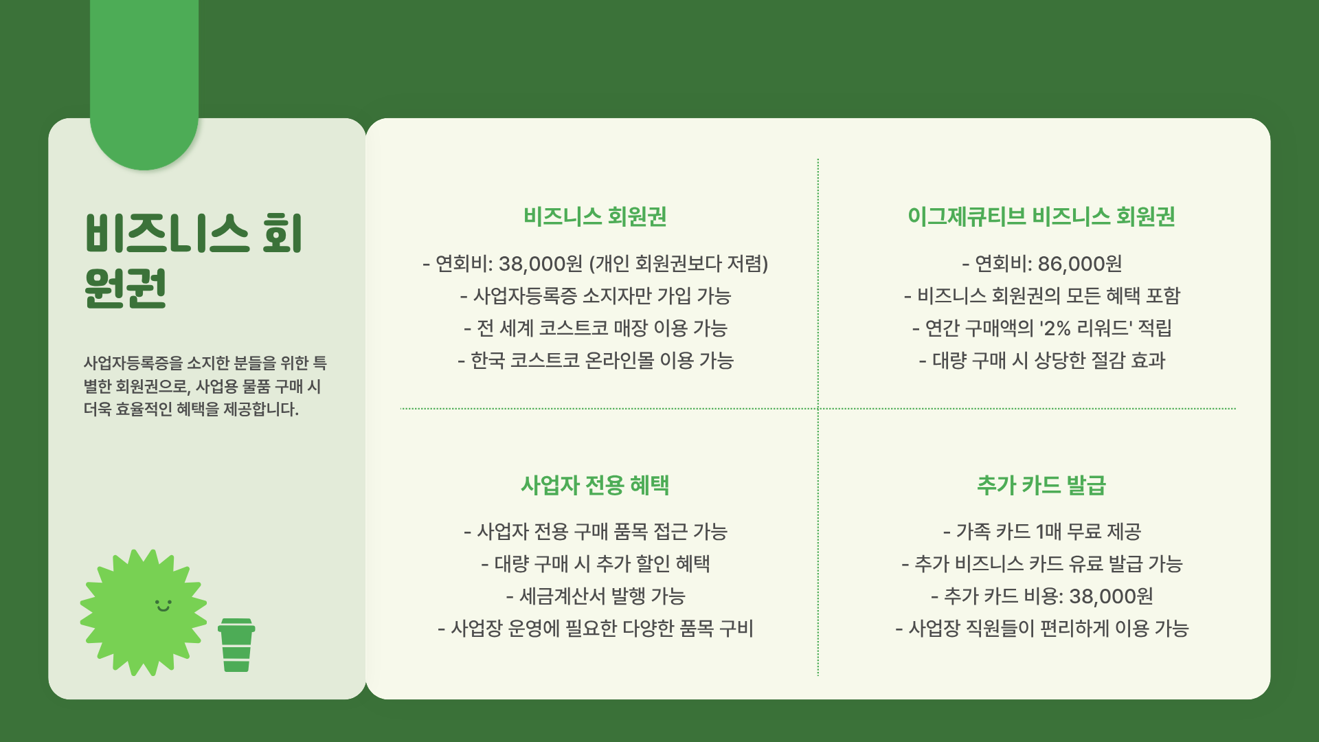 | 38,000원 | 사업자등록증이 있는 사업자를 위한 회원권. 전 세계 코스트코 매장 및 온라인몰 이용 가능. 가족 카드 1매 포함. 추가 비즈니스 카드 발급 가능 (연회비 동일 38,000원). |