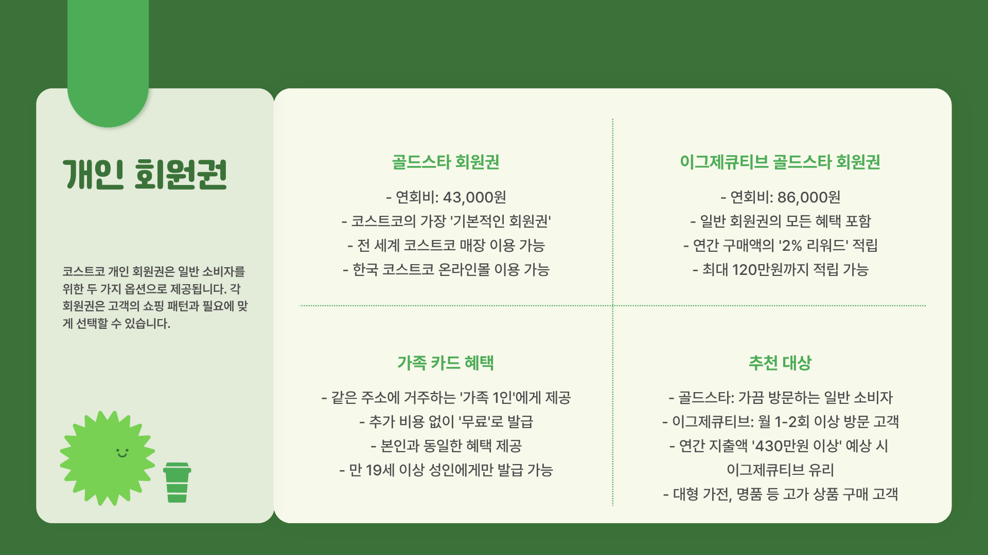 - 특징: 코스트코의 가장 기본적인 회원권입니다. 이 카드가 있으면 전 세계 코스트코 매장과 한국 온라인몰을 이용할 수 있습니다.
