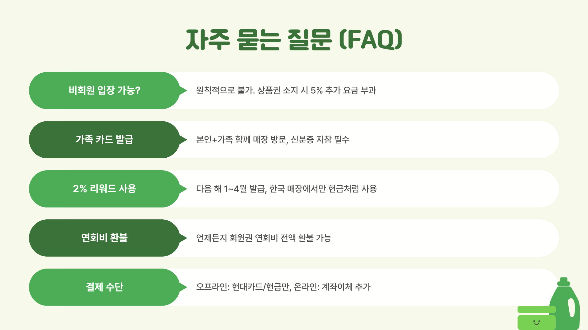 - 오프라인 매장: 현대카드 또는 현금만 결제 가능합니다. 다른 신용카드나 체크카드는 사용할 수 없으니, 방문 전에 반드시 현대카드를 준비해야 합니다.