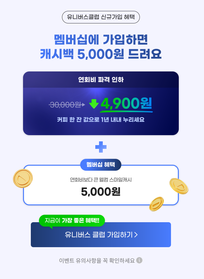 클럽 가입 시 연회비(3만 원)보다 많은 금액의 스마일캐시(3만 5천 원 이상)를 즉시 돌려받는 구조입니다. 사실상 연회비를 전액 돌려받고 추가 혜택까지 받는 것과 같으며, 매월 제공되는 고가 할인 쿠폰과 무제한 5% 할인 혜택을 통해 그 가치를 충분히 상회합니다.