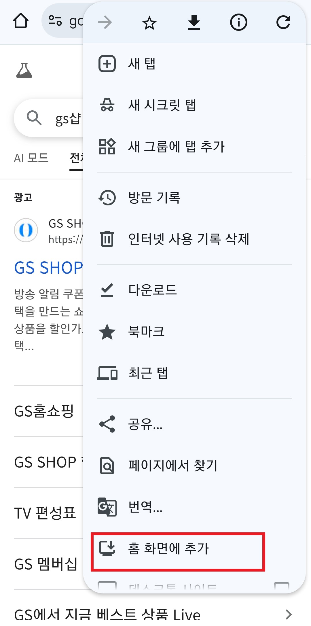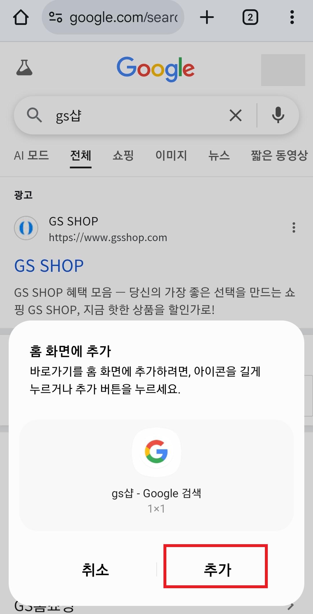 - 사파리 (Safari - iOS): GS SHOP 모바일 웹사이트에 접속합니다. 하단 메뉴에서 '공유' 버튼(네모 상자 위 화살표)을 누르고, '홈 화면에 추가'를 선택하면 됩니다.