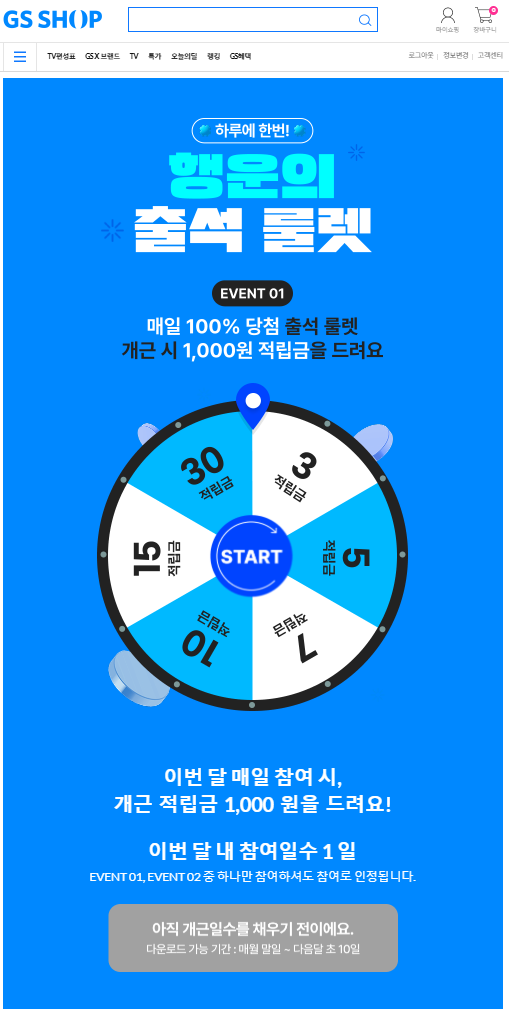 GS SHOP 모바일 앱에 접속 후, 메인 화면 또는 마이페이지 근처에 위치한 '출석 체크' 이벤트 배너를 클릭하여 참여할 수 있습니다. 매일 참여하여 적립금을 받고, 한 달 동안 빠짐없이 참여(개근)하면 추가 보너스 적립금 혜택을 놓치지 않고 받을 수 있습니다.